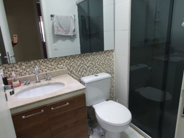 Cozinha planejada, banheiros com gabinete e box.