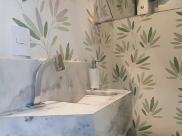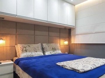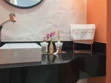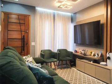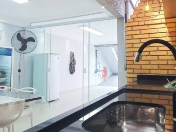 87m², 2 suítes amplas, sendo 1 com varanda, sala de TV, lavabo, cozinha ampla, área gourmet com churrasqueira à carvão e lavabo, área de serviço e 2 vagas de garagem.