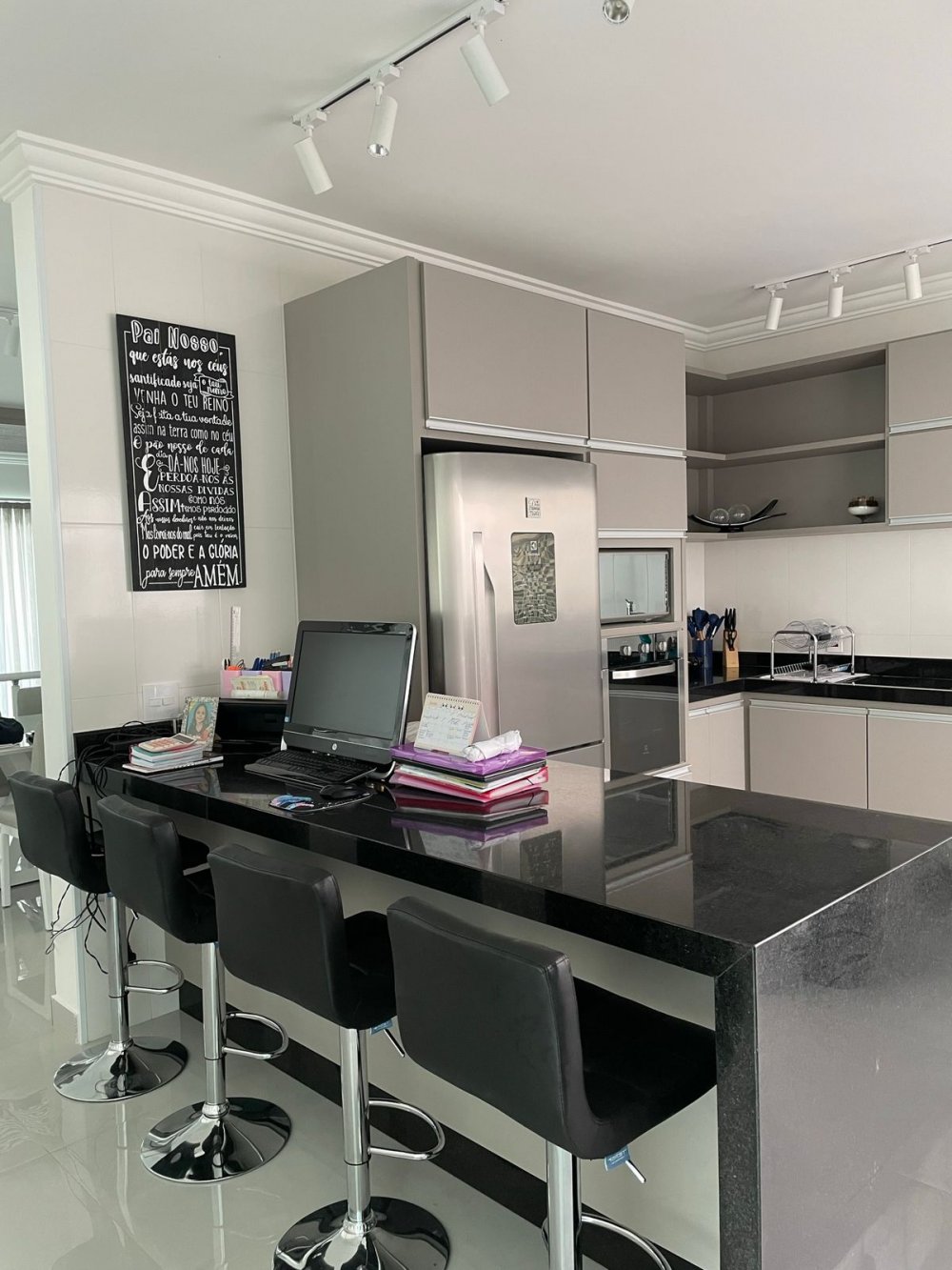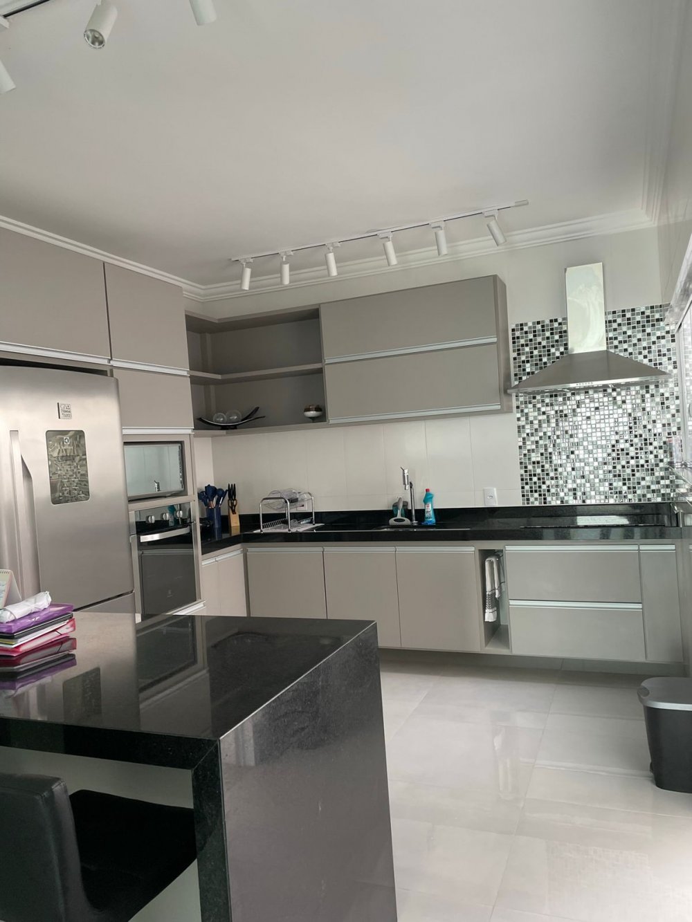 Cozinha com móveis planejados e eletrodomésticos.