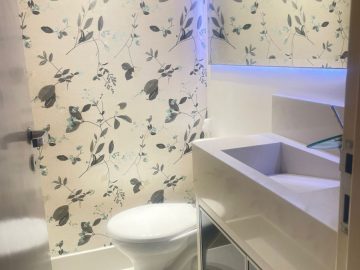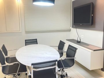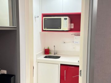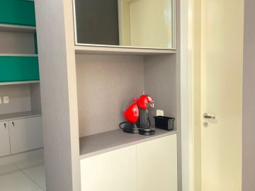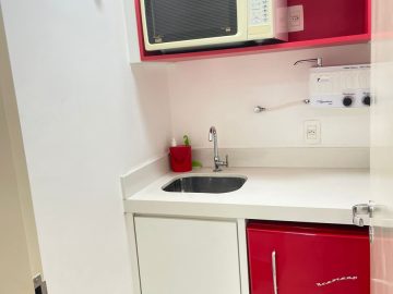 Ar condicionado, geladeira, micro-ondas, máquina de café, mesa, cadeiras, televisão, 1 banheiro, 1 copa, 1 vaga de garagem.