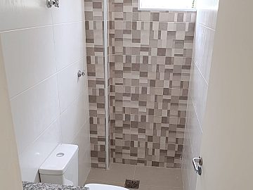 Banheiro com revestimento moderno;